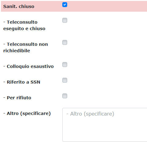La parte sanitaria apparirà CONCLUSA nelle liste di ricerca quando sarà messo il segno di spunta sulla casella “Sanit. Chiuso” . Questa casella è quindi quella FONDAMENTALE da usare. Le altre caselle servono a specificare meglio il motivo e possono essere usate anche per registrare azioni intermedie prima di chiudere la scheda (se poi la persona richiamerà per un problema diverso si aprirà una nuova scheda).