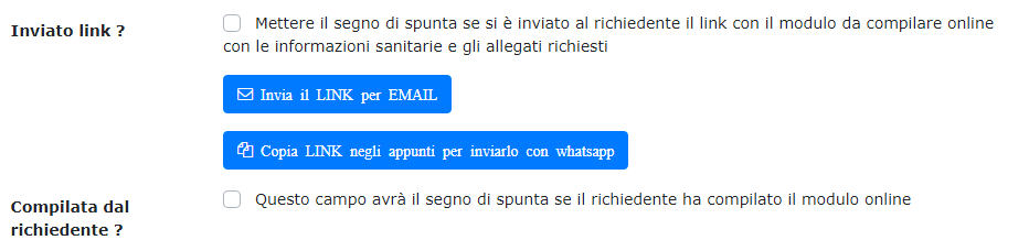 La casella “Inviato Link” serve appunto a registrare il fatto che è stato inviato al richiedente il link per compilare questo modulo , mentre la casella “Compilata dal richiedente” registra il fatto (in automatico) che il richiedente ha compilato la scheda e l’ha salvata.
